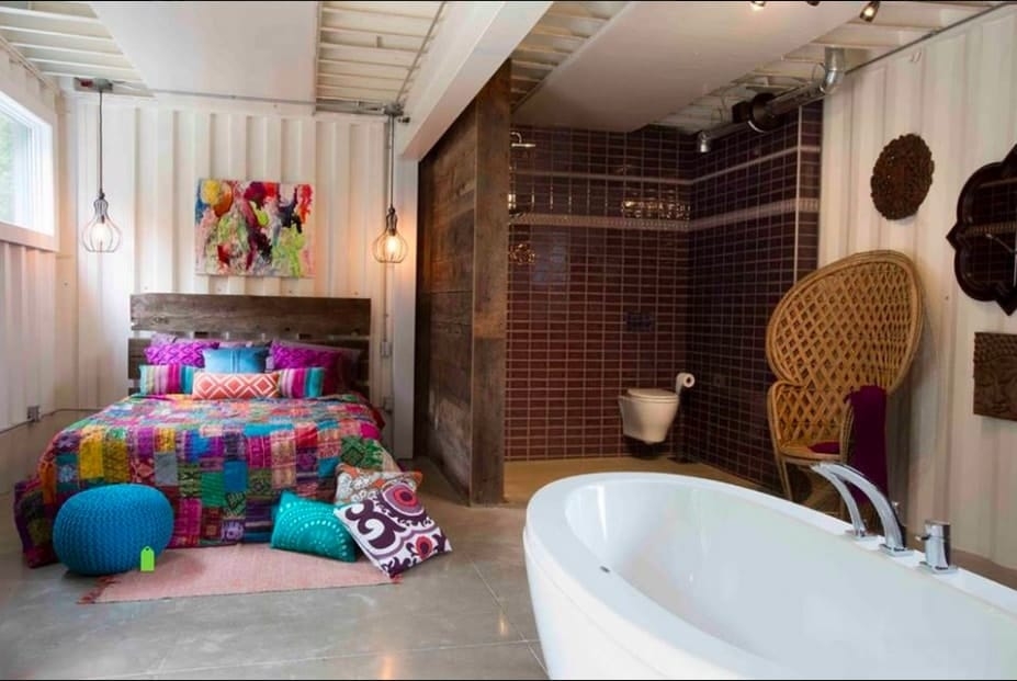 Trên thực tế, đây là phòng ngủ và phòng tắm, vì hai phòng đó được kết hợp với nhau trong ngôi nhà này. Màu sắc ấm áp cũng như đèn chiếu sáng và chăn ga gối đầy màu sắc giúp biến đây thành nơi hoàn hảo để thư giãn sau một ngày làm việc mệt nhọc.