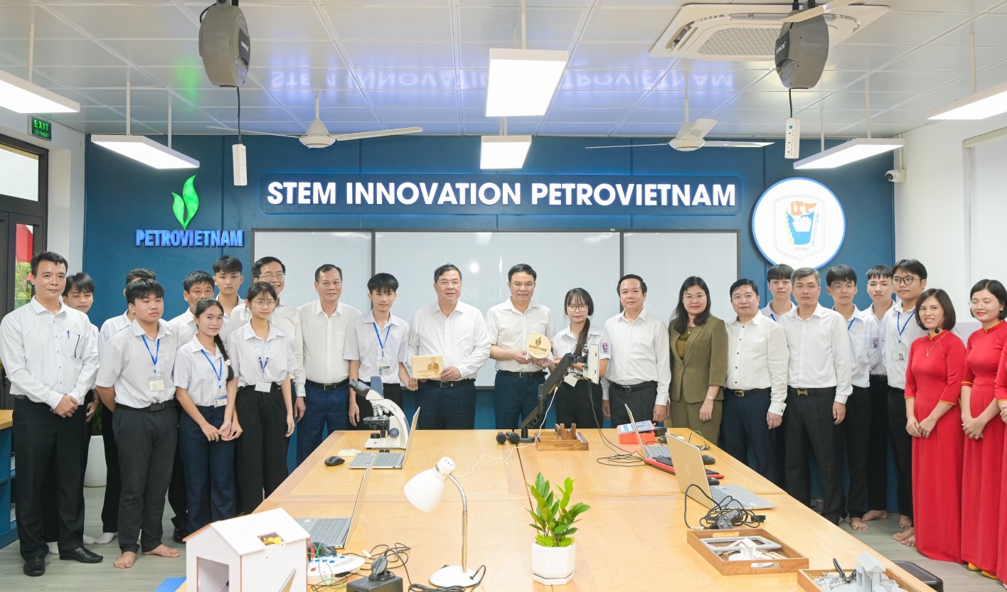 Ông Phan Anh Minh, Ủy viên BCH Đảng bộ Petrovietnam, Bí thư Đảng ủy Nghiên cứu Khoa học và Đào tạo, Chủ tịch Hội đồng PVU và ông Phan Minh Quốc Bình, Hiệu trưởng PVU, Phó Viện trưởng VPI trao giải Nhất và chúc mừng các thành viên đội PVU 01 |