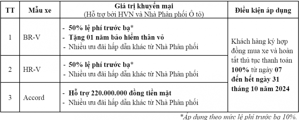 Honda Việt Nam cho biết, trong tháng 10/2024 hãng sẽ phối hợp cùng hệ thống nhà phân phối triển khai chương trình khuyến mại dành cho các dòng xe nhập khẩu như Honda HR-V, Honda BR-V và Honda Accord. Chương trình khuyến mại được HVN áp dụng từ ngày 7 - 31/10/2024, dành cho khách hàng ký hợp đồng và hoàn tất thanh toán 100%.