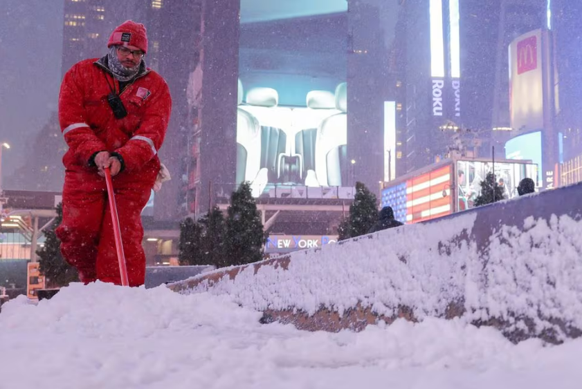 | Một công nhân dọn tuyết ở Quảng trường Thời đại ở Thành phố New York, Mỹ, ngày 16 tháng 1 năm 2024. Ảnh Reuters |