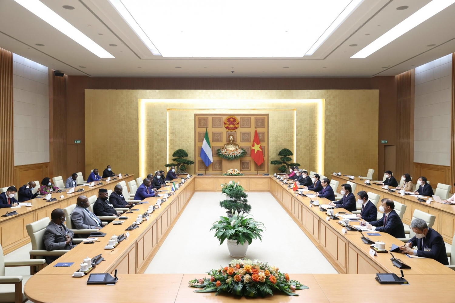 Thủ tướng Chính phủ Phạm Minh Chính nhiệt liệt hoan nghênh Tổng thống Julius Maada Bio thăm chính thức Việt Nam, coi đây là biểu hiện sinh động của mối quan hệ hữu nghị và hợp tác giữa hai nước, đặc biệt trong bối cảnh hai nước đang kỷ niệm 40 năm thiết lập quan hệ ngoại giao. Thủ tướng chúc mừng những thành tựu nhân dân Sierra Leone đã đạt được trong quá trình xây dựng và phát triển đất nước thời gian qua. Thủ tướng khẳng định với đường lối đối ngoại rộng mở, là bạn, là đối tác tin cậy của các quốc gia trên thế giới, Việt Nam luôn coi trọng mối quan hệ hữu nghị và hợp tác với các nước bạn bè châu Phi, trong đó có Sierra Leone. Thủ tướng đánh giá cao những bước phát triển tốt đẹp trong quan hệ giữa hai nước và nhấn mạnh hai bên còn rất nhiều tiềm năng để có thể nâng cao hơn nữa hiệu quả hợp tác, nhất là trong các lĩnh vực thương mại, đầu tư, nông nghiệp, công nghệ, giáo dục - đào tạo, an ninh, quốc phòng, giao lưu nhân dân… Thủ tướng đề nghị các bộ, ngành, doanh nghiệp hai bên cần phối hợp chặt chẽ, triển khai có hiệu quả các thỏa thuận hợp tác trên các lĩnh vực có nhiều tiềm năng, làm tiền đề mở rộng sang các lĩnh vực khác. Lãnh đạo các bộ, ngành liên quan của hai nước cần gặp gỡ, trao đổi cụ thể các biện pháp thúc đẩy hợp tác; các cơ quan nhà nước, doanh nghiệp hai bên cần nỗ lực nhiều hơn nữa, tăng cường giao lưu, tiếp xúc, đẩy mạnh các hoạt động quảng bá về thị trường mỗi nước, tạo điều kiện thuận lợi cho các doanh nghiệp của nhau tìm kiếm cơ hội hợp tác kinh doanh và đầu tư nhằm nâng cao tính hiệu quả và thực chất trong quan hệ song phương. Thủ tướng Chính phủ Phạm Minh Chính khẳng định Việt Nam sẵn sàng cùng Sierra Leone tìm kiếm các mô hình phù hợp nhằm đẩy mạnh hợp tác trong lĩnh vực nông nghiệp, đặc biệt trong trồng và chế biến lúa gạo.