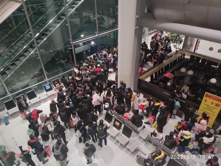 | Bà con người Việt di tản từ Ukraine tập trung ra máy bay khởi hành từ thủ đô Bucharest, Romania về nước. (Ảnh:Baoquocte.vn) |
