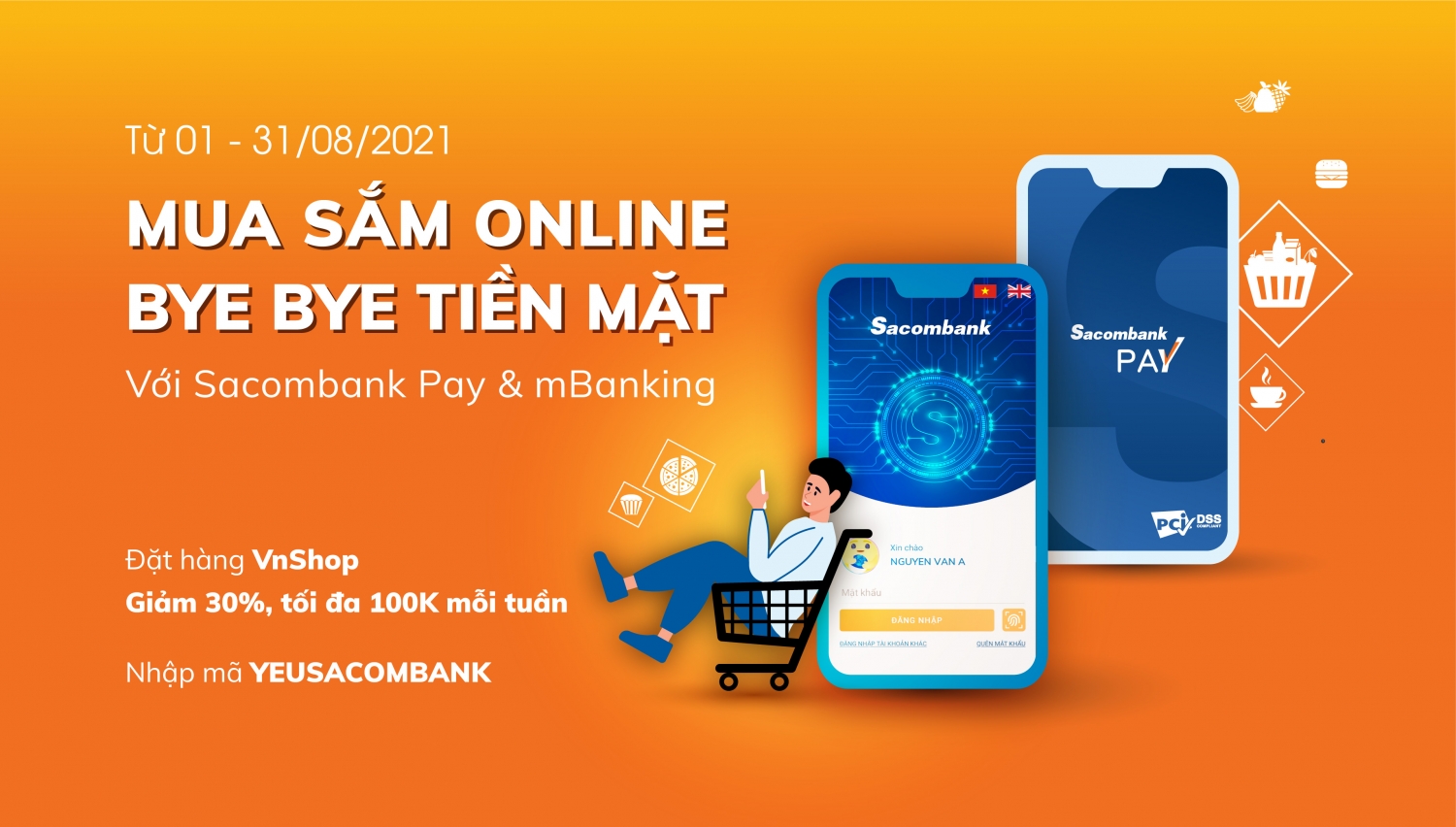 Từ ngày 1/8/2021 đến hết ngày 31/8/2021, Sacombank triển khai chương trình khuyến mãi “Mua sắm online - Bye bye tiền mặt” dành cho khách hàng cá nhân khi mua sắm trực tuyến VnShop trên ứng dụng Sacombank mBanking và Sacombank Pay.